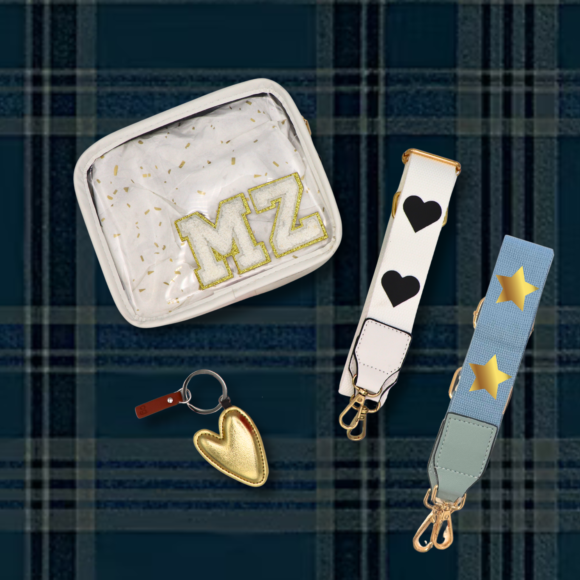 First up, there’s a clear monogrammed stadium purse, because rules may be rules, but style is always key. Add some sparkle with a gold star purse strap or go for the sweet side with a pink heart strap—she can swap them out depending on her vibe! And for that perfect finishing touch? A gold heart keychain that adds a little love wherever she goes.